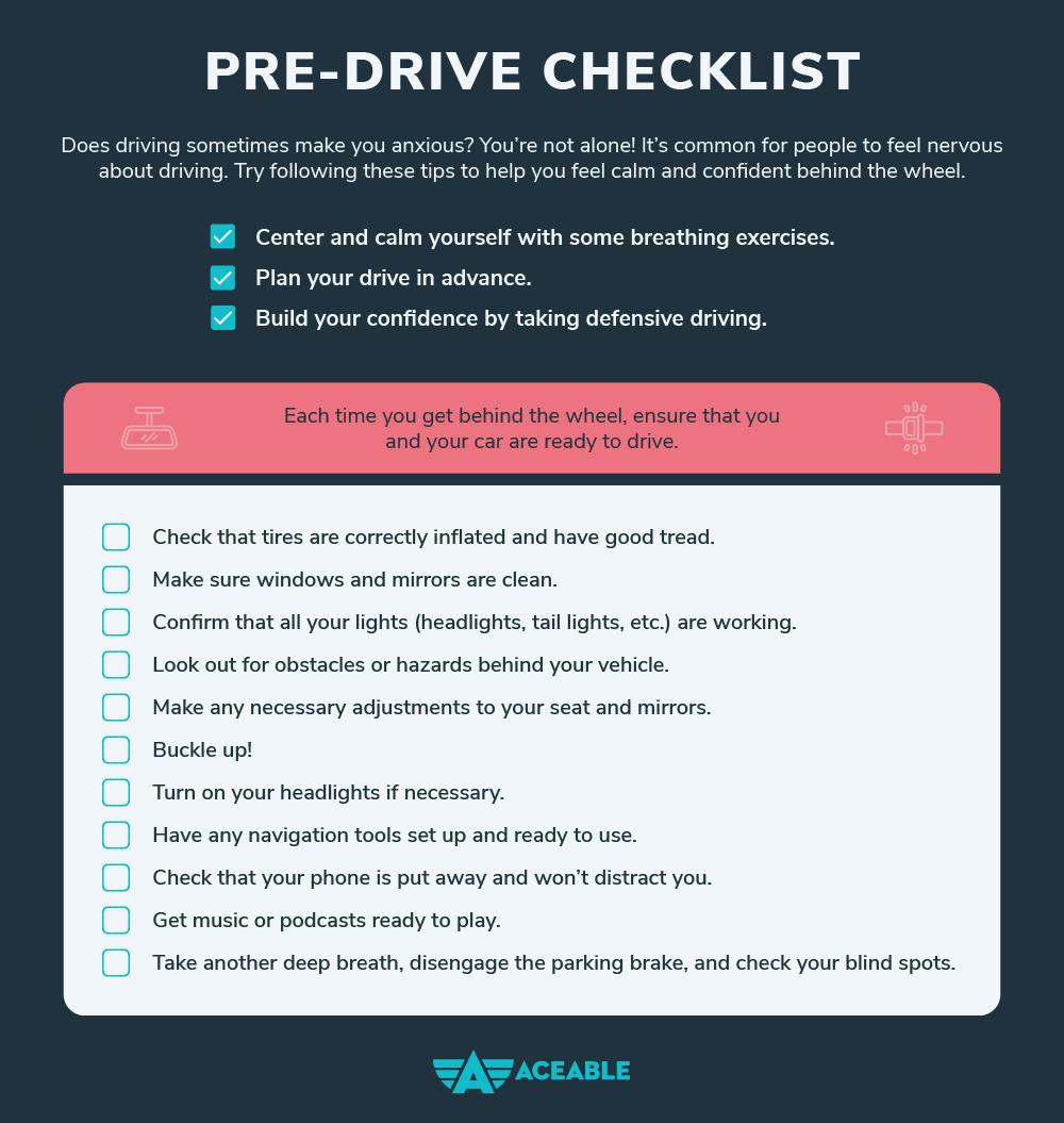 Having a driving checklist to look over before your drive can get you into a routine and help alleviate anxiety around driving. Take a look at this sample checklist and use it as-is or adapt it to fit your needs!