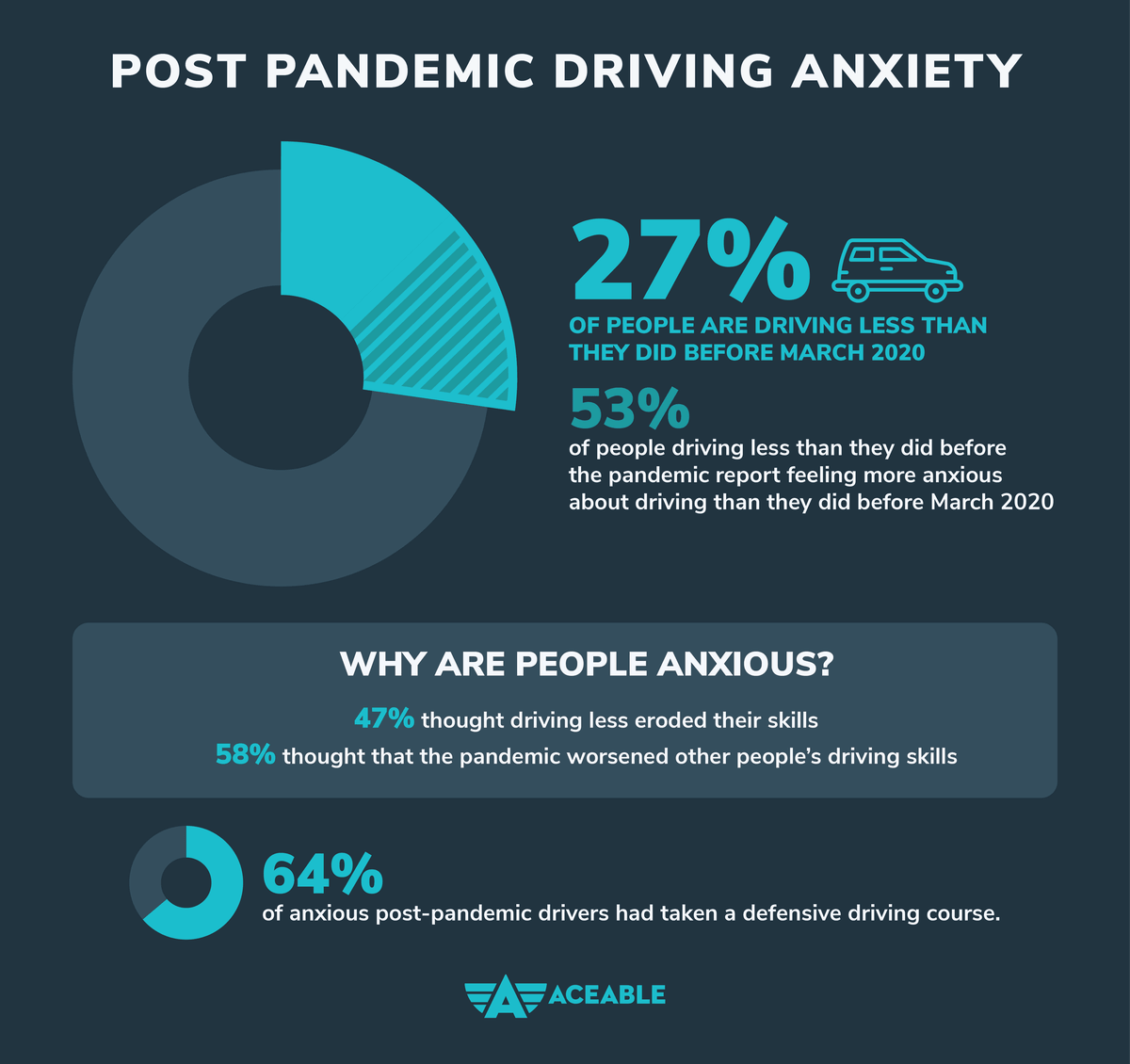 And as folks have gotten back on the road, there have been a few bumps along the way. An Aceable studyWhat You Need Know About Driving Anxiety Post Pandemic Blog found that, as of March 2022, 27% of people are still driving less than they did before March 2020.