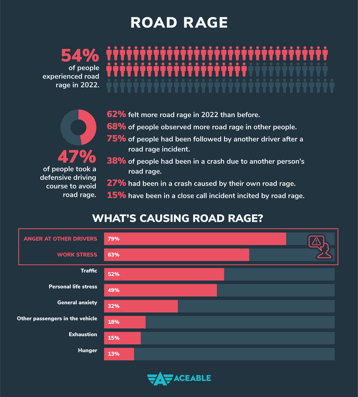 The massive increase in road rage this year had serious consequences. Of the people surveyed, 38% of people had been in a crash due to another person’s road rage, 27% had been in a crash caused by their own road rage, and 15% have been in a close-call incident incited by road rage.