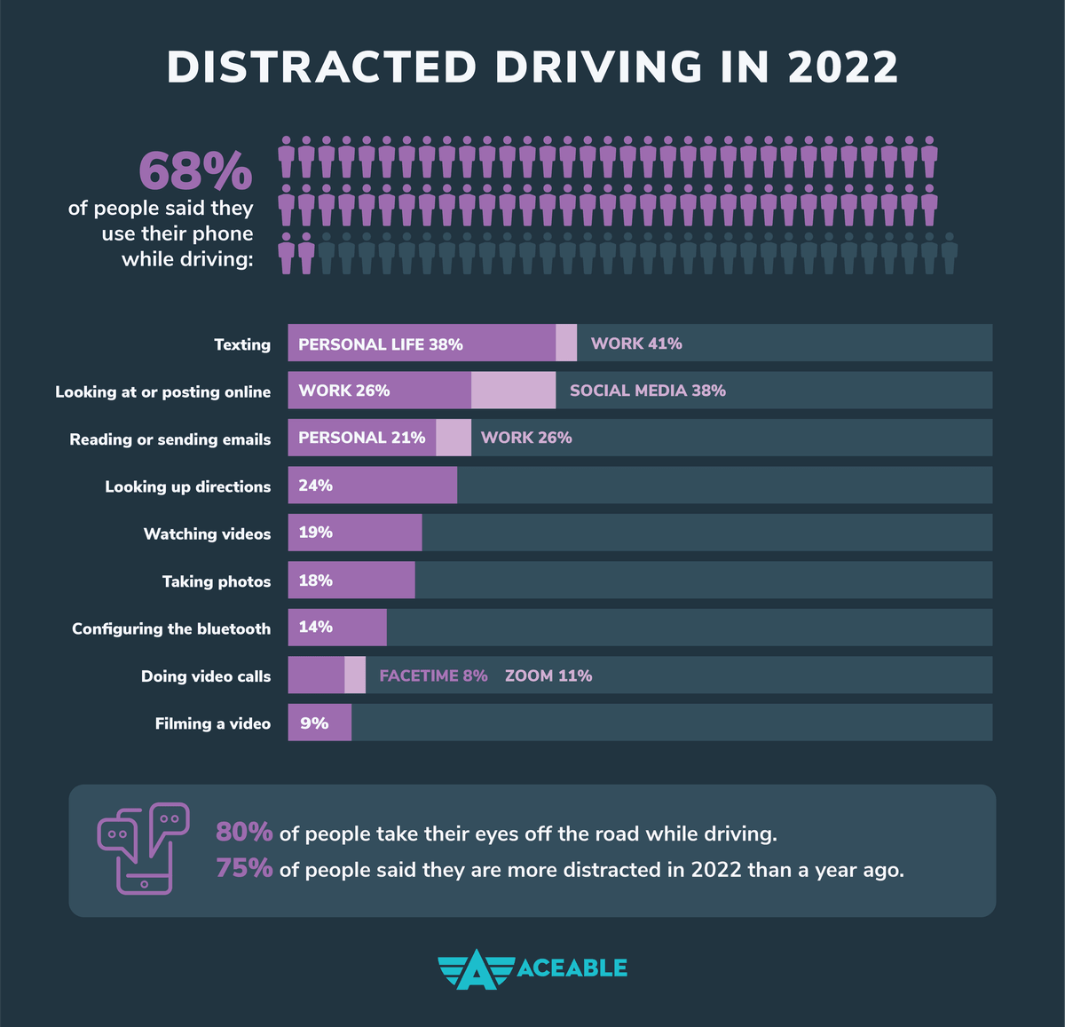In an Aceable survey, 80% of people admitted to taking their eyes off the road to look at their phone, mess with the radio, eat, or do something other than driving.