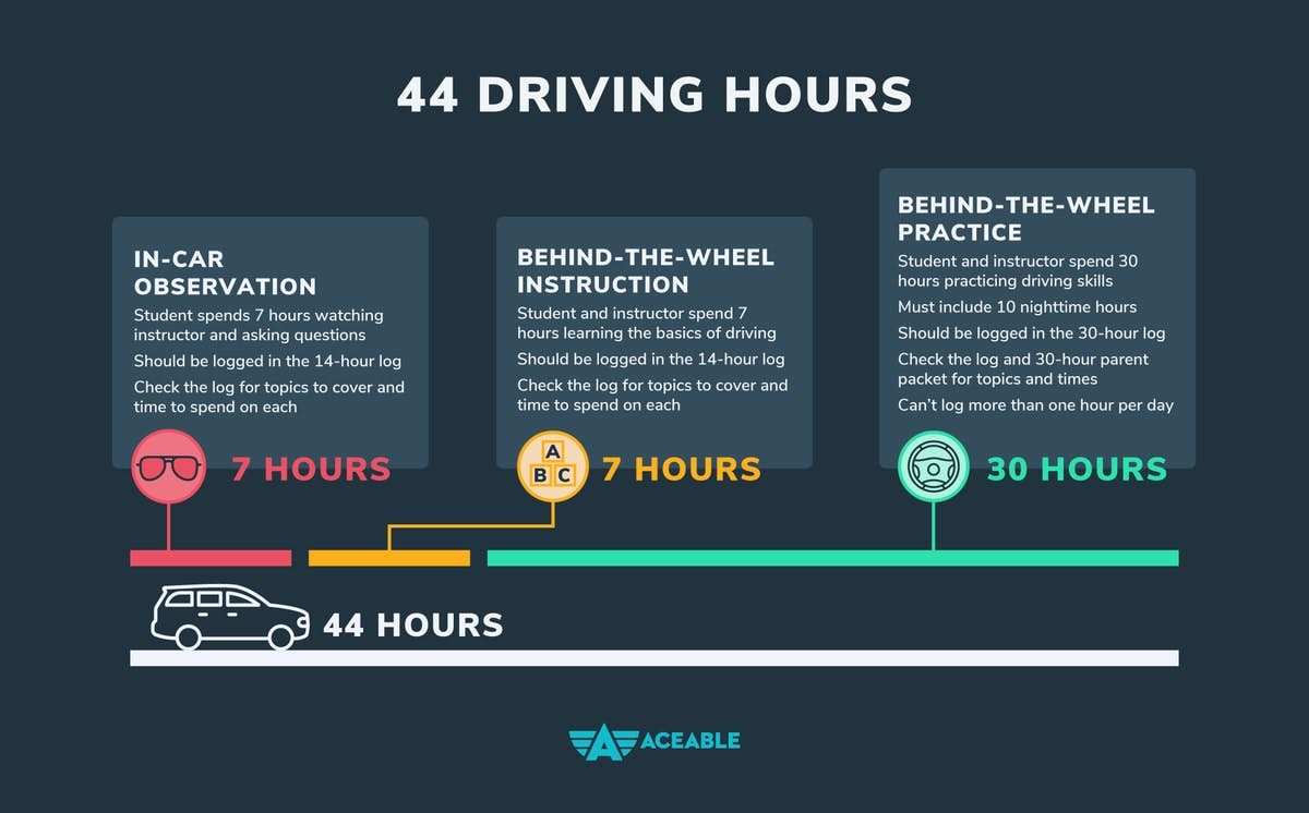 Another 30 hours of driving (at least 10 hours at night) can be with any licensed driver over the age of 21 that the parent instructor has certified. In total, your teen will need to do 44 hours of behind-the-wheel training.