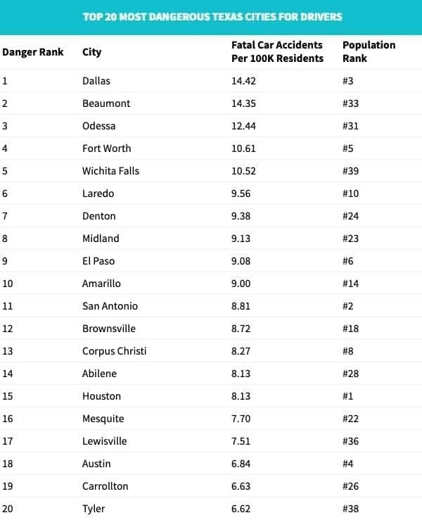 Of the 40 most populated cities in Texas, Aceable calculated which cities have the highest rate of fatal car accidents per 100,000 residents, using 2018 data from Texas Department of Transportation (TXDOT)Pub Txdot Info Trf Crash_statistics 2018 14.pdf Ftp.txdot.govPub Txdot Info Trf Crash_statistics 2018 14.pdf Ftp.txdot.gov and U.S. Census estimatesWiki List_of_cities_in_Texas_by_population En.wikipedia.orgWiki List_of_cities_in_Texas_by_population En.wikipedia.org. Below are the findings.