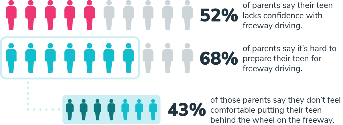 Parents also feel nervous about teaching their teens to drive on the highway. According to our driving study, 68% of parents say it’s hard to prepare their teen for freeway driving, and 43% of those parents say they don’t feel comfortable putting their teen behind the wheel on the freeway.