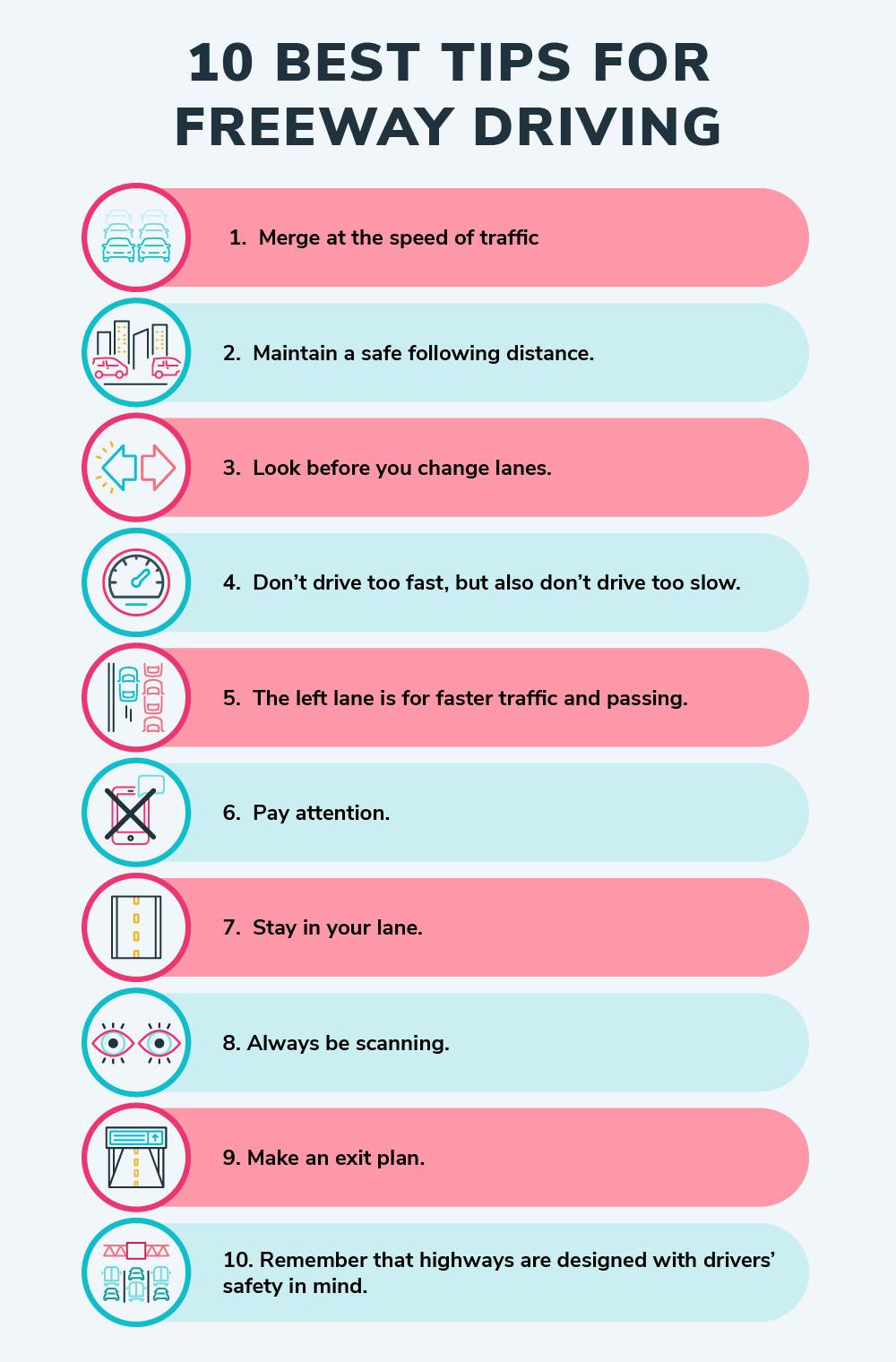 Speeding is dangerous, but driving too slowly can also cause problems. Try to stay with the flow of traffic without speeding. That’s the sweet spot for freeway driving.