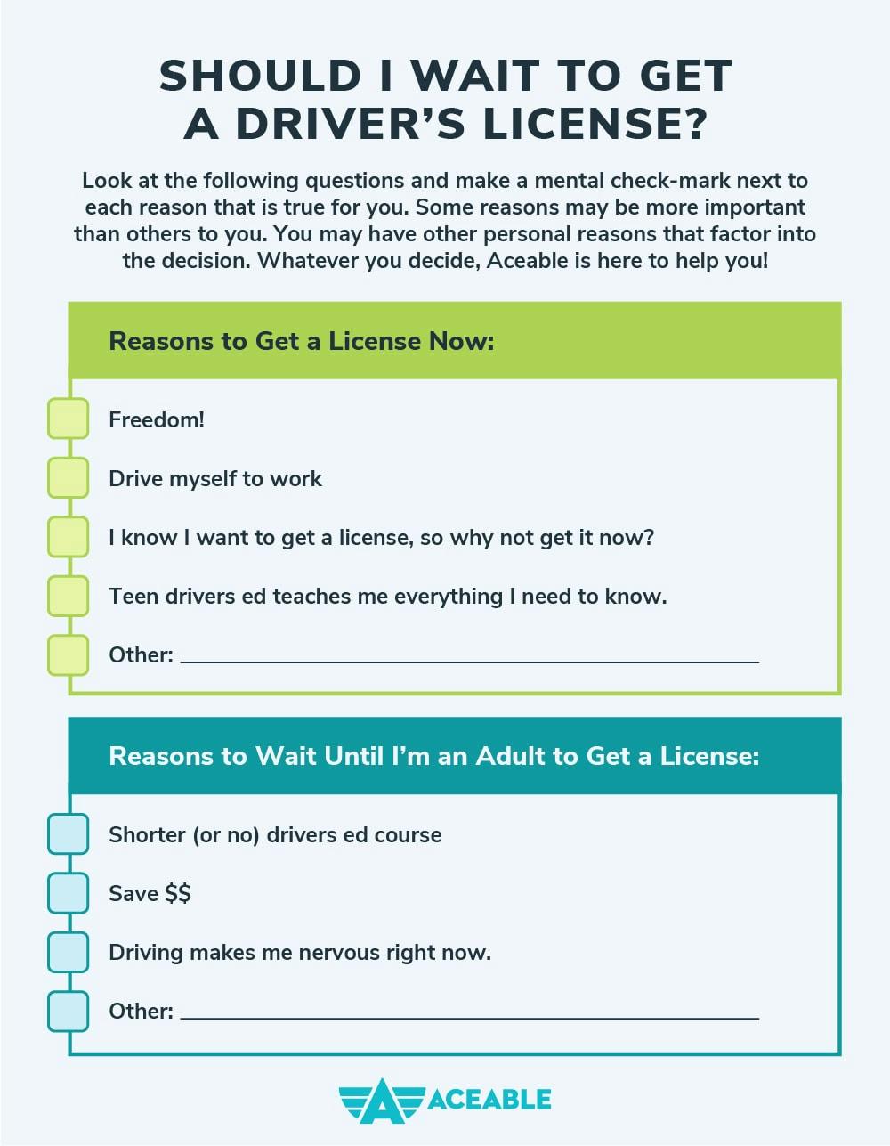 What Did You Decide?Whether you choose to start a teen drivers ed course today Drivers EdDrivers Edor you’d prefer to put off thinking about getting a drivers license for the foreseeable future, Aceable has driving courses that will help you get your license and keep you safe on the road at any age!