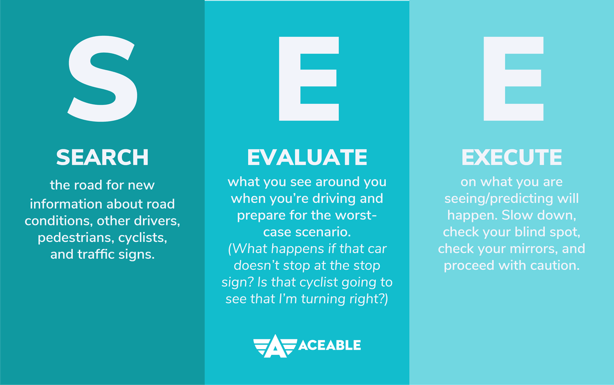 EVALUATE what you see around you when you’re driving, and prepare for the worst-case scenario. (What happens if that car doesn’t stop at the stop sign? Is that cyclist going to see that I’m turning right?)