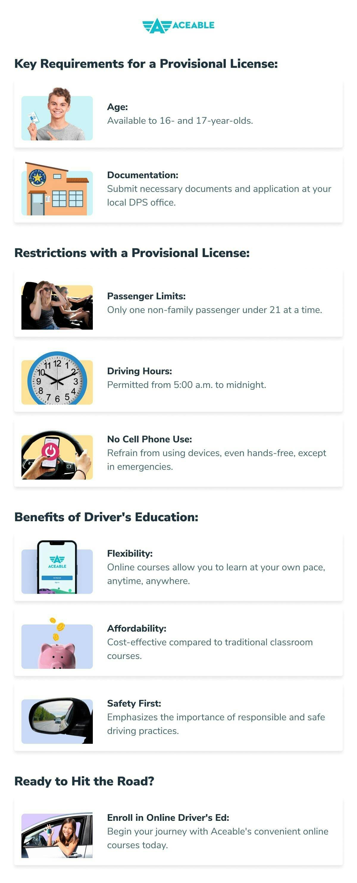 The provisional driver’s license in Texas acts as a stepping stone between the learner’s permit and the full driver’s license. It allows 16- and 17-year-olds to drive without the supervision of an adult while also providing legal restrictions designed to keep young drivers as safe as possible during the transition.