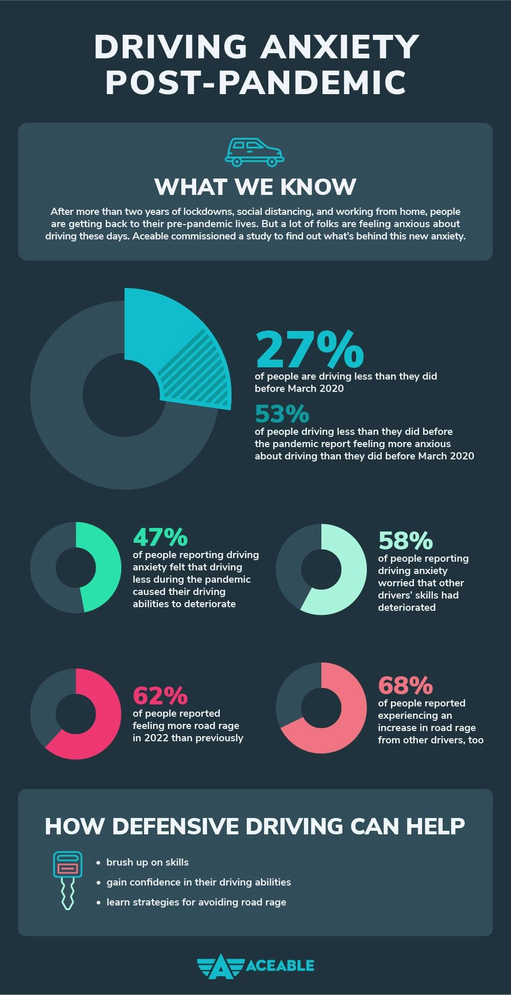 Aceable’s 2022 driving anxiety survey makes it clear that drivers are feeling more anxious and more prone to road rage than they were before the pandemic began. There are many potential causes for this change: skill loss from driving less, increased traffic, and trauma from the pandemic itself.